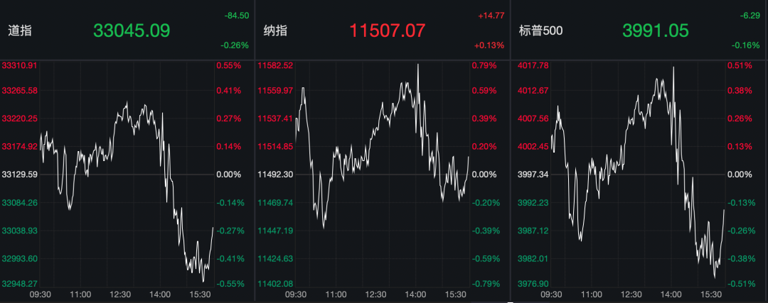 这份会议纪要公布后,美股三大指数尾盘集体跳水,道琼斯指数瞬间跌近300点,由涨转跌;标普500指数亦抹去0.5%的涨幅,失守4000点整数位,与道指齐创一个月来最低;纳指一度转跌但尾盘勉强收涨。截至收盘,道指跌0.26%,纳指涨0.13%,标普500指数跌0.16%。