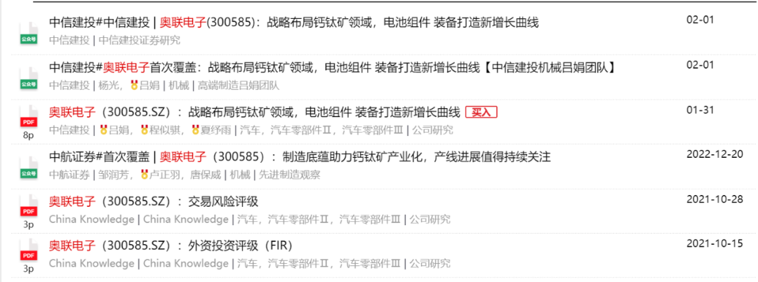 2022年12月中旬,中航证券率先发布首次覆盖报告《制造底蕴助力钙钛矿产业化,产线进展值得持续关注》,点出“钙钛矿”概念,并给予“买入”评级,该研报显示彼时奥联电子的股价仅19.17元。不过,纵观该研报,主要从公司角度对公司竞争力进行梳理,泛泛提及“胥明军先生长期专注于钙钛矿太阳能电池技术研究”等信息,并未提及广受争议的“华能清能院”项目。