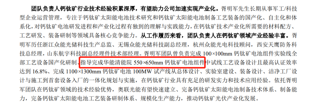 记者注意到,从公开信息来看,在奥联电子此前披露的2022年12月16日投资者关系活动记录表中,就曾明确提到“胥明军团队曾负责完成100×100mm钙钛矿电池组件实验线全部工艺设备国产化研制、指导完成华能清能院550×650mm钙钛矿电池组件中试线工艺设备设计且最高认证效率达到16.8%”这一信息。
