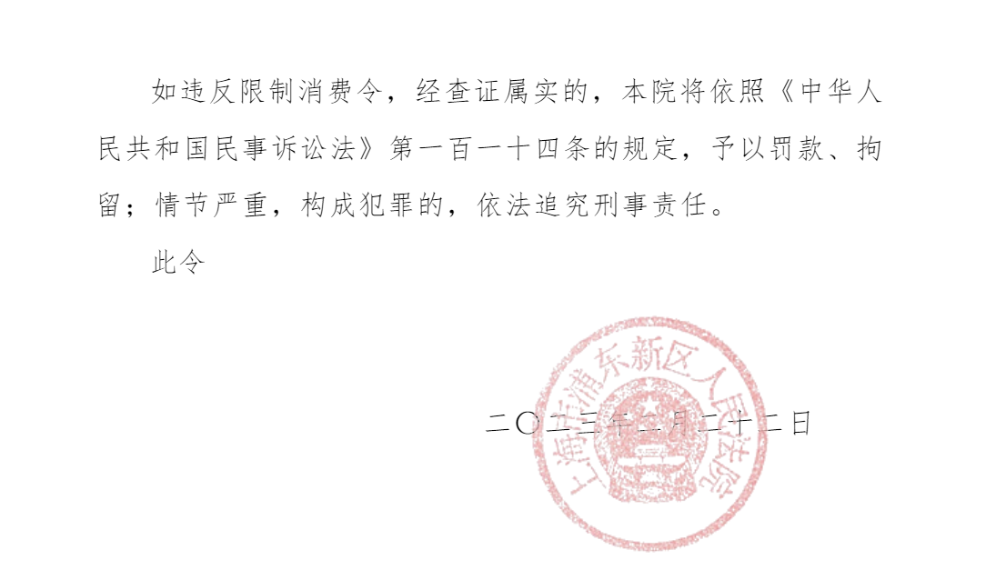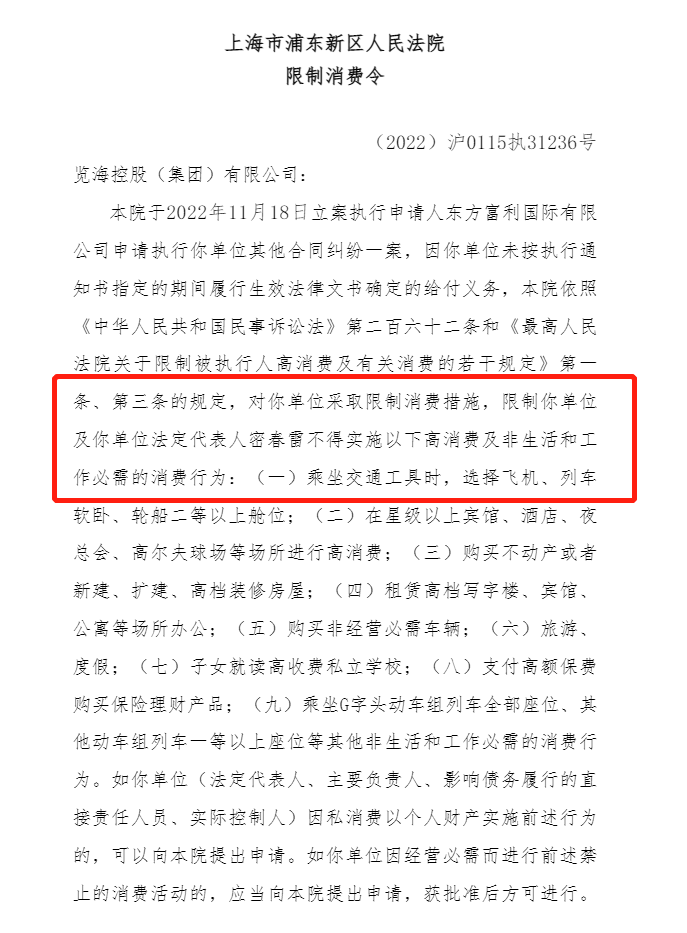据中国执行信息公开网,上海市浦东新区人民法院2月22日发布的限制消费令显示,在东方富利国际有限公司与览海控股(集团)有限公司(以下简称“览海控股”)相关合同纠纷案中,因览海控股未按执行通知书指定的期间履行生效法律文书确定的给付义务,对览海控股采取限制消费措施,限制览海控股及览海控股法定代表人密春雷不得实施高消费及非生活和工作必需的消费行为,其中包括,乘坐交通工具时,选择飞机、列车软卧、轮船二等以上舱位等。