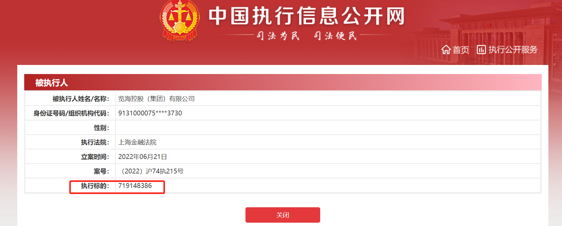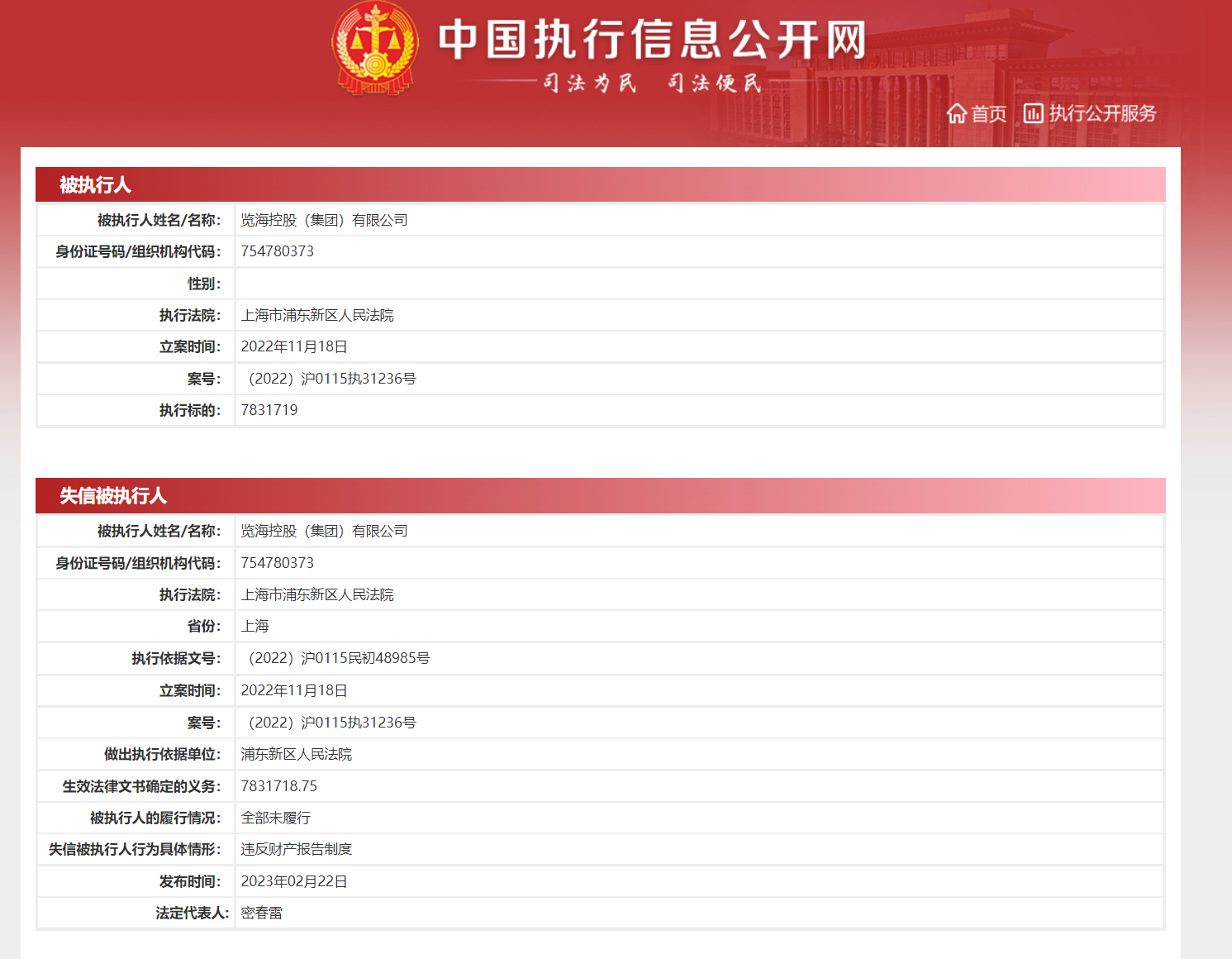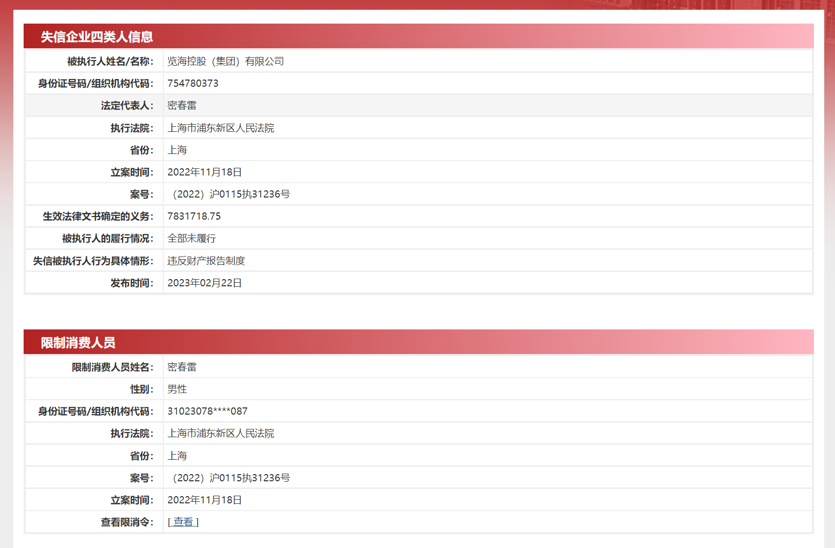 2022年6月21日,密春雷、上海览海投资有限公司、览海控股(集团)有限公司新增被执行案件,执行标的约7.19亿元,执行法院为上海市金融法院,案号均为(2022)沪74执215号。