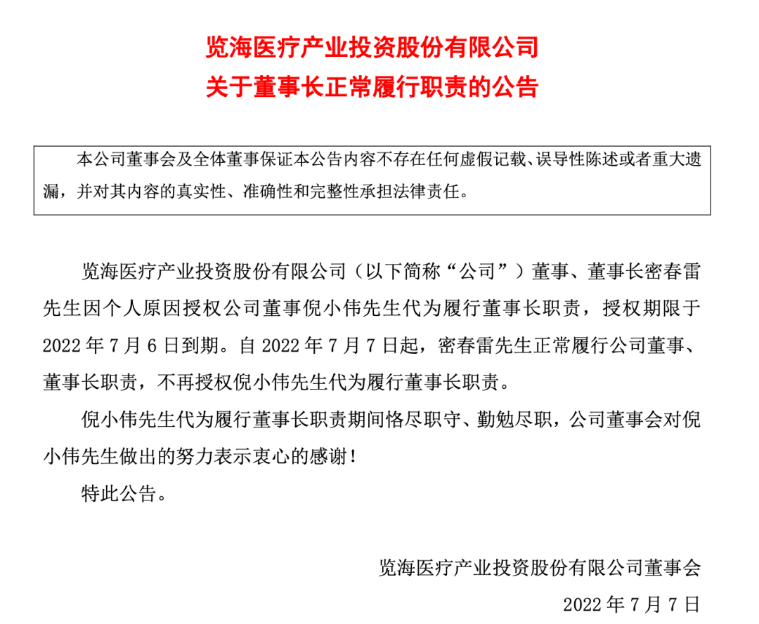 2022年7月6日晚间,退市海医披露公告称,董事、董事长密春雷因个人原因授权公司董事倪小伟代为履行董事长职责,授权期限于7月6日到期, 自7月7日起,密春雷正常履行公司董事、董事长职责,不再授权倪小伟代为履行董事长职责。
