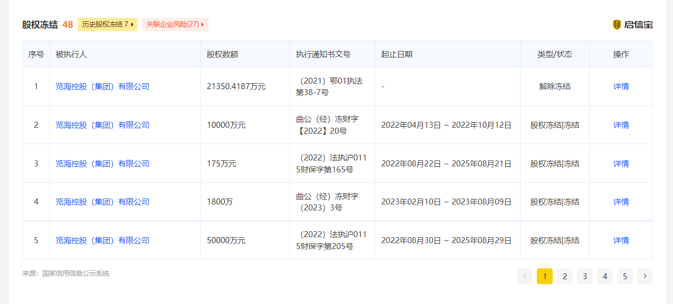除此之外,览海控股所持有的相关股权也遭冻结。