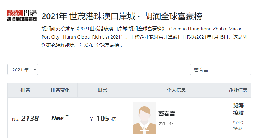 证券时报此前消息,据报道,密春雷出生于上海崇明,2003年创办览海控股(集团)有限公司,为人颇为低调神秘,被称为 “上海隐形富豪”。2019年的胡润百富榜上,密春雷以60亿元人民币财富排名684位。2020年密春雷再次上榜,身家超百亿。2021年的胡润百富榜显示, 密春雷的财富超过100亿元人民币。