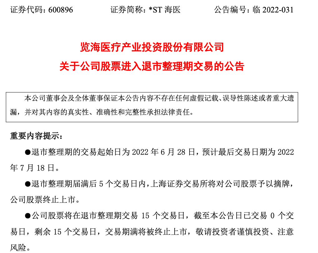 按照相关规定,览海医疗股票将于6月28日进入退市整理期交易,证券简称将由“*ST海医”变更为“退市海医”,退市整理期为15个交易日,最后交易日为7月18日。