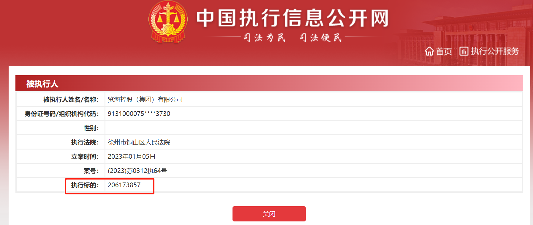 2023年1月5日,览海控股(集团)有限公司新增被执行案件,执行标的约2.06亿元。