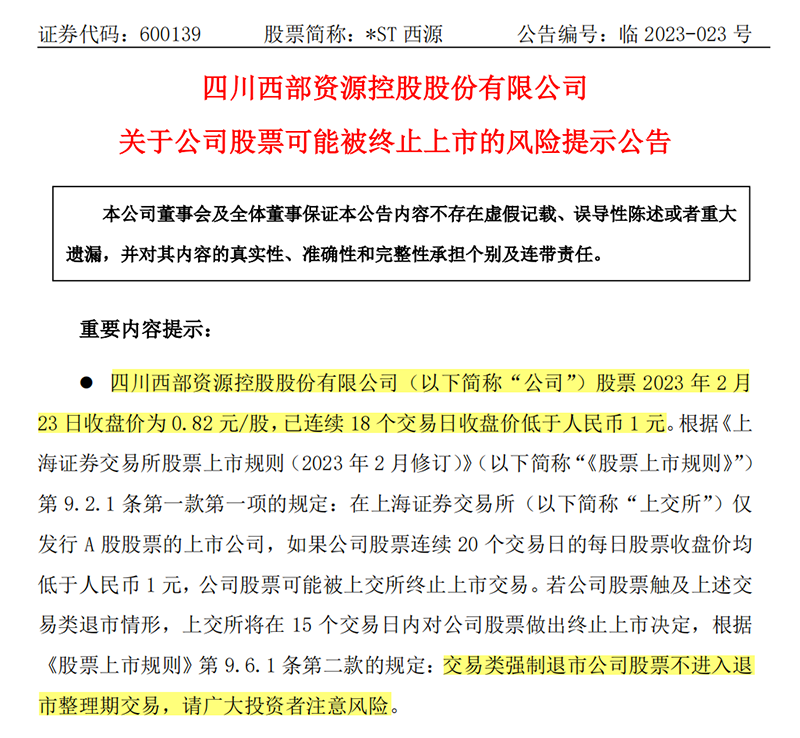 2月23日晚间,*ST西源发布风险提示公告称,公司股票2月23日收盘价为0.82元/股,已连续18个交易日收盘价低于1元。
