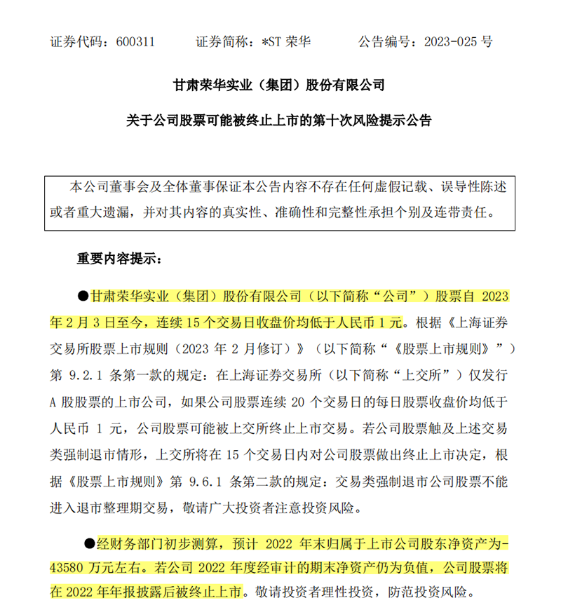 此外,经财务部门初步测算,*ST荣华预计2022年末归属于上市公司股东净资产为-4.358亿元左右。若公司2022年度经审计的期末净资产仍为负值,将触发“净资产为负”退市指标,公司股票将在2022年年报披露后被终止上市。
