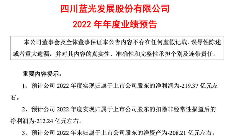 1月31日,蓝光发展披露2022年业绩预告显示,亏损额度超过200亿元,预计年末净资产为-208.21亿元,公司股票预计将于年报披露后被实施退市风险警示。业绩预告披露后,蓝光发展股价持续下跌,截至2月23日,蓝光发展收盘价为1.09元/股,直逼交易类退市警戒线。