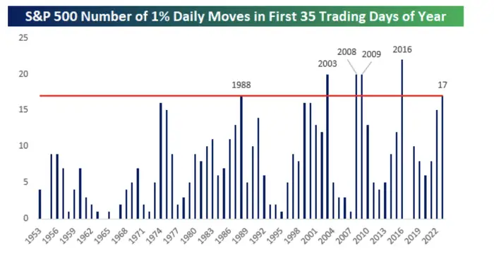 截至美东时间周三,标普500指数迎来了2023年的第35个交易日,其中近一半交易日的日波动幅度为1%以上。而回顾历史,往年出现这种情况的年份分别是1988年、2003年、2008年、2009年和2016年。