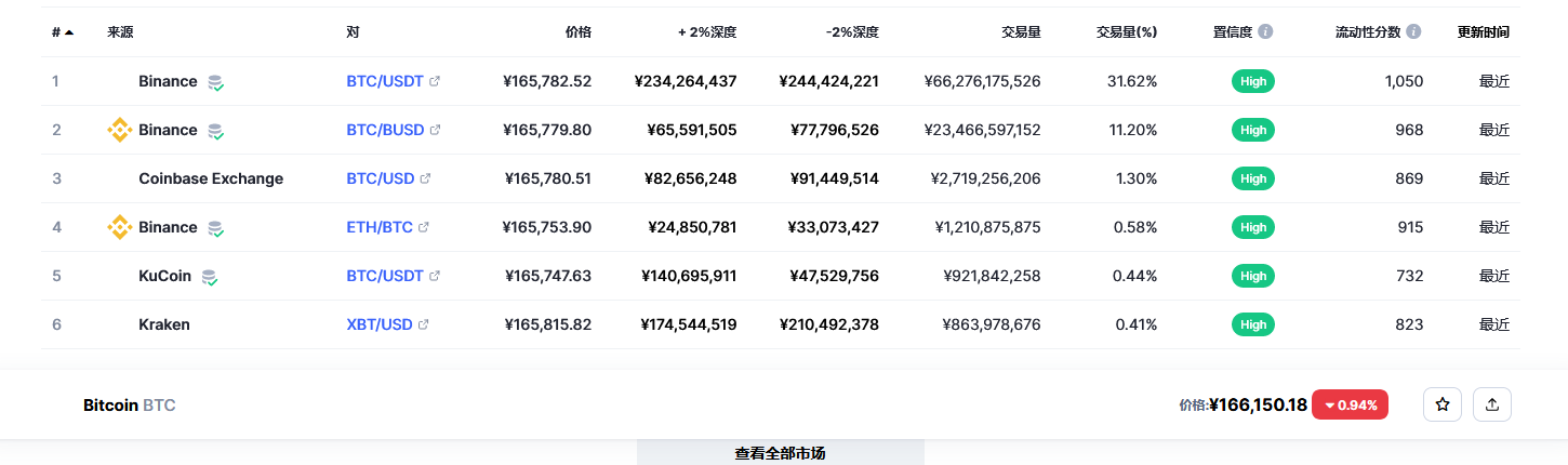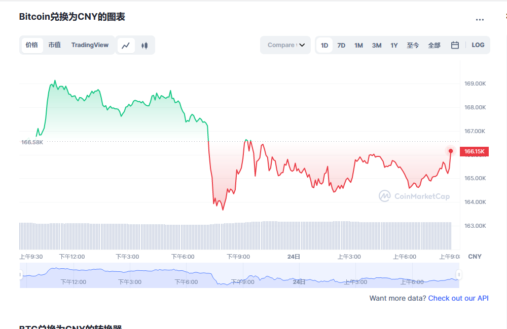 导读Bitcoin 今日价格 为 ¥165,615 CNY,其 24 小时的交易量为 ¥209,579,726,067 CNY。 我们会实时更新BTC兑换为CNY的价格。 Bitcoin 在过去 24 小时内下跌了 0.69。 目前的 世链财经 排名为第 #1 位