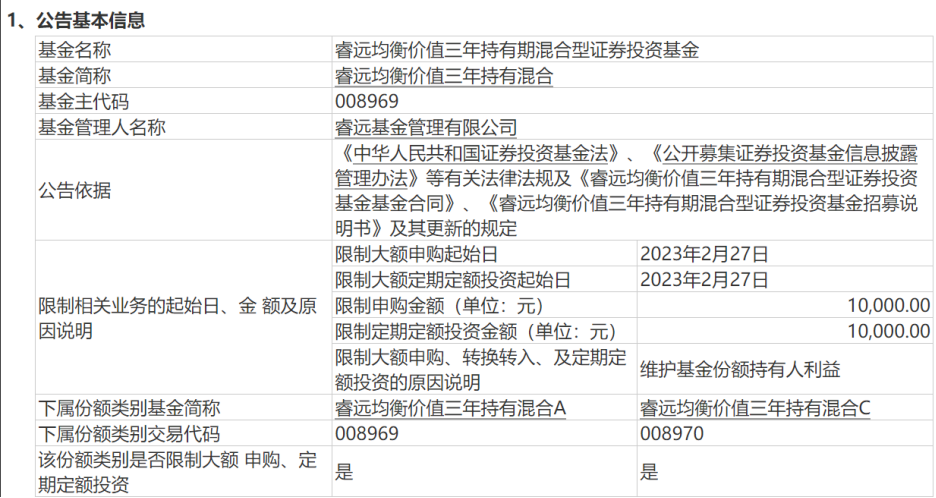 睿远基金2月23日发布的《睿远均衡价值三年持有期混合基金调整大额申购及定期定额投资业务限额的公告》显示,为维护基金份额持有人利益,2月27日起,该基金限制申购及定期定额投资金额由30万元调整至1万元。