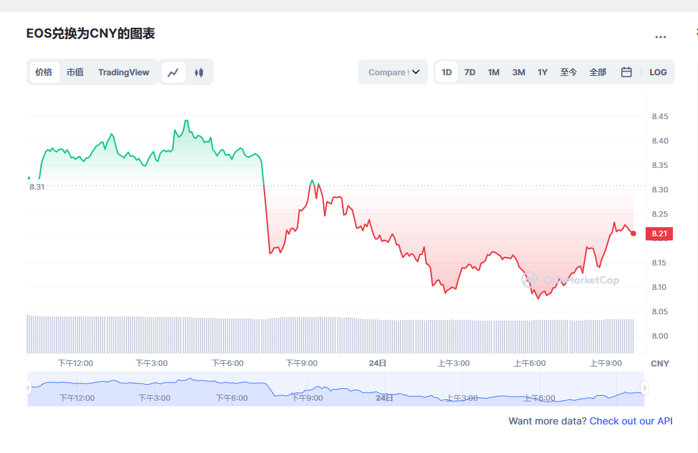 EOS 今日价格 为 ¥8.21 CNY,其 24 小时的交易量为 ¥995,678,495 CNY。 我们会实时更新EOS兑换为CNY的价格。 EOS 在过去 24 小时内下跌了 1.38。 目前的 CoinMarketCap 排名为第 #43 位,其市值为 ¥8,880,251,095 CNY。 其流通供给量为 1,081,263,745 EOS 个货币 目前无法提供供给量上限信息。