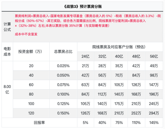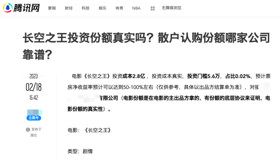 有相关方发布信息称,该影片投资成本2.8亿,投资门槛5.6万元可获得0.02%份额,预计票房净收益率可以达到50-100%。还特意说明份额是在主出品方拿的,有份额的底层协议来证明。