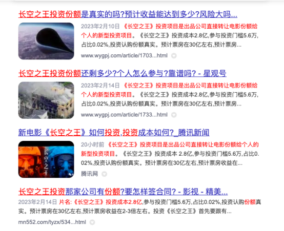 记者在搜索引擎以“长空之王投资份额”为关键词搜索发现,目前的确有不少关于该片投资份额转让的信息。