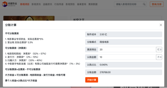 公司官网还有分账计算功能,以《长空之王》为例,票房预估20亿元,认购10万元,分账金额可达27.88万元。