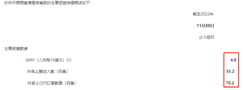 公司称,“于报告期间的快速增长乃由于我们从专注于线上教育向自营产品及直播电商的战略转型取得重大进展”。数据显示,公司截至2022年11月30日止六个月的GMV达到48亿元,来自抖音的GMV占绝大部分。于报告期,抖音上第三方产品及自营产品的已付订单总数为7020万单,期末抖音关注人数达到3520万人。