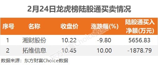 陆股通参与龙虎榜中个股共涉及两股,其中湘财股份被净买入5656.83万元,而拓维信息被净卖出1878.79万元。