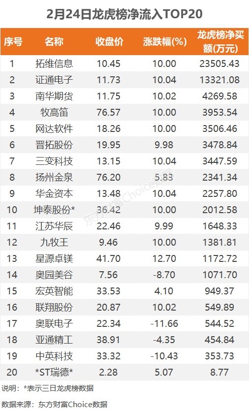 龙虎榜:2.35亿抢筹拓维信息 机构净买7股 外资净买1股