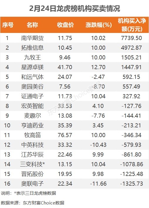 机构参与龙虎榜中个股共涉及16股,其中7股被机构净买入,南华期货被买入最多,为7739.5万元。另外9股被机构净卖出,奥联电子被卖出最多,为1325.73万元。