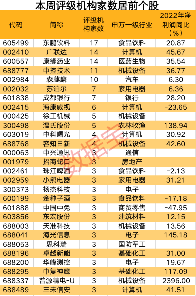 电子板块个股众多,其中海光信息、华峰测控、扬杰科技分别获得3家机构的评级。海光信息2022年净利润同比增长145.18%。
