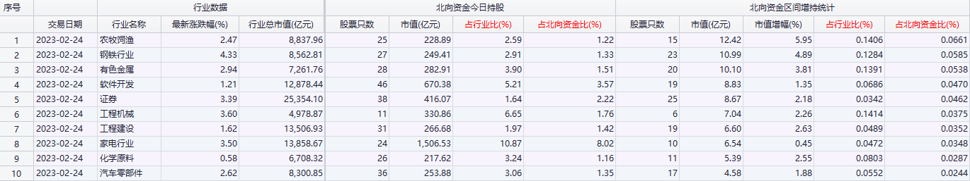 从行业增仓情况来看,近5个交易日农林饲渔板块被北向资金净买入最多,达到12.42亿元,钢铁和有色金属分列第二、第三位。