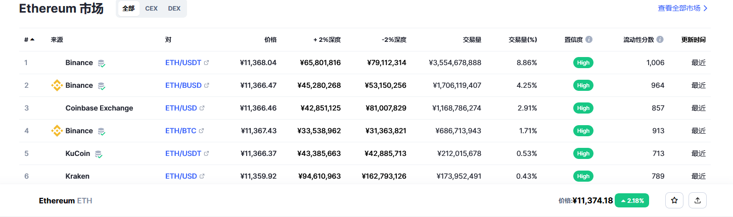 以太坊(ETH)各个交易所价格