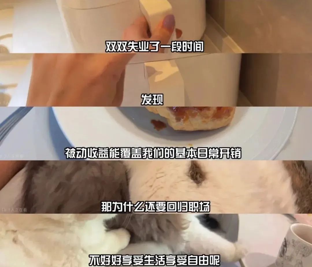 视频中陈女士表示,不上班不用应付同事,拒绝无效社交。衣服裤子鞋子化妆品护肤品消费全都减少了,有更多的时间关心呵护自己的身体。拒绝外卖,自己动手健康饮食。在上海2人2猫,一个月花1w绰绰有余。