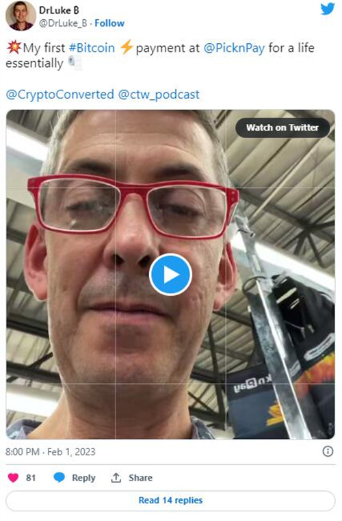 Twitter 用户分享了他们在 pick n Pay 商店使用比特币支付日常用品的经验:
