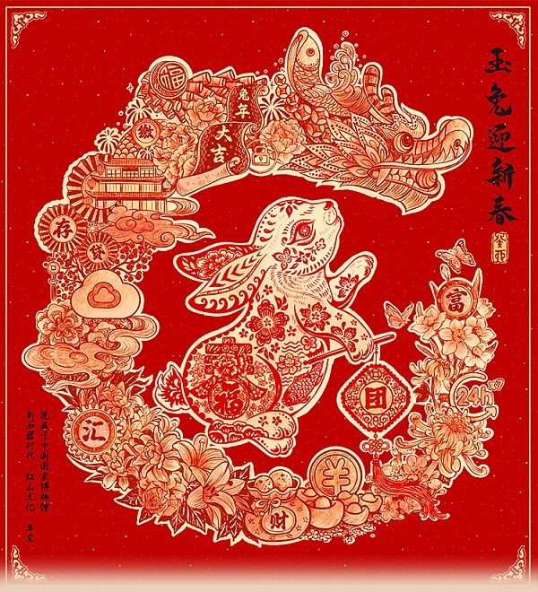 藏品寓意方面,通过将红山文化的代表文物“玉龙”与生肖兔结合,象征新年的生肖兔被央视国宝大会标志性的“玉龙”环绕,身着福气满春堂,手持寓意“团圆”的贺岁灯,与“玉龙”共赴新程,共迎新春。