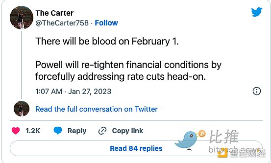 Twitter 用户名为 The Carter 的市场策略师也警告道,随着美联储会议临近,鲍威尔周三将以比市场目前预期更为强硬的方式表态,包括加密货币市场在内的风险资产的“大屠杀”可能成为现实,他认为,这将导致所有风险资产的大幅抛售,其中包括比特币和大多数其他数字资产。他在推文中写道:“2 月 1 日,市场会见‘血’,鲍威尔将通过正面强行降息来重新收紧金融状况”。