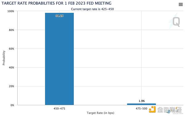 宏观投资者 James Choi 发推文说: “我预计美联储将把基金利率提高 25 个基点(已经反映在价格中),并让鲍威尔发表鹰派言论,但这只是烟雾弹,市场具有前瞻性,它将在 3 月份开始定价‘暂停’,届时标准普尔 500 指数将达到 4500 点。”