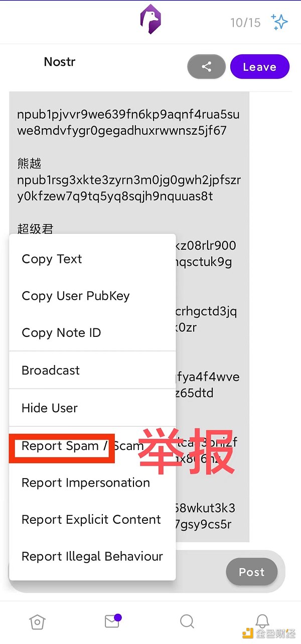 添加好友时,可以通过搜索其公钥添加,在这上面的每条私信或者群聊消息,贴文都会有自己的一个Note ID,可以通过搜索Note ID直达。