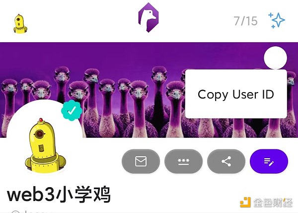 点击个人头像进入个人主页后,在自己的头像后面,并排着四个按钮,第一个信封按钮是发私信的按钮,可以自己给自己发私信。第二个按钮是私钥地址,点击后就自动复制了自己的私钥,第三个按钮是公钥按钮,也是点击后会自动复制,而主页右上方的白色按钮,也是公钥复制按钮,点击后会弹出“copy User ID "字样。