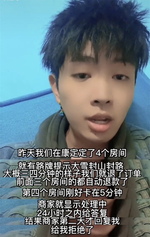 据媒体报道,2月23日,一游客在康定市祥驴酒店预订了四间房间,紧跟着看到大雪封山的提示路牌,便申请退房。