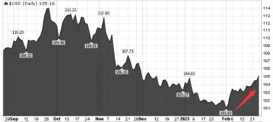 然而如今,当人们回过头来看,市场人士在年初无疑“高兴得太早了”:衡量美元兑一篮子六种主要货币强弱的ICE美元指数在上周五已强势升破105关口,刷新了1月6日以来的最高位。