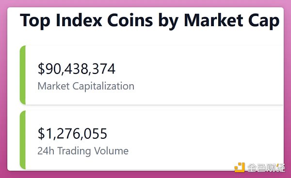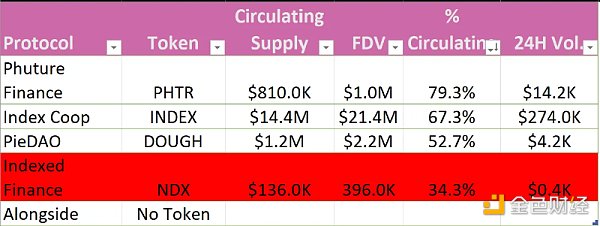 他们的代币市值、交易量证明了我们在链上指数方面是多么早期。除了 Index Coop 的 INDEX 之外,它们都是小市值的代币,交易量极低。