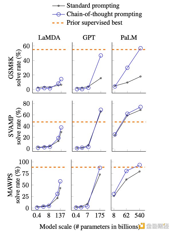 思维链的能力在模型够大的情况下,可以接近甚至超过有监督的方法(橙色虚线)。