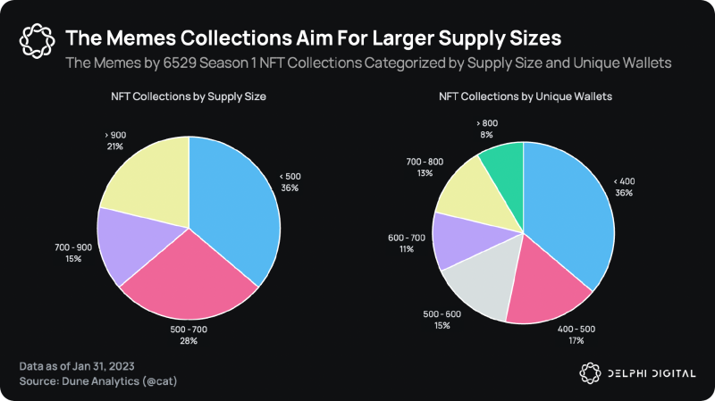 该项目旨在发布供应量大、价格低的 NFT,以鼓励广泛分发。目前,21%的收藏品的供应规模高于 900 个 NFTs。此外,21%的收藏品也被超过 700 个单一钱包所持有。铸币成本始终为每个 NFT 0.06529 ETH,其中 50% 的收入与原创艺术家分享。 该系列还收取 6.9% 的创作者费用。