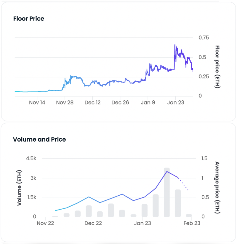 NFT 系列在过去三个月经历了大规模的牛市。所有 NFT 的综合市值从 2022 年 11 月的 2.7K ETH 反弹到今天的近 50K,涨幅超过 17 倍。综合市值在 2023 年 1 月 23 日创下了 71.8K ETH 的历史新高。与此同时,持有 NFT 的单一钱包数量也从同期的 3.5K 增加到 6.2K,增长了 76%。