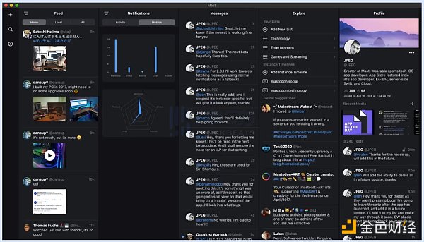 Mastodon 同样拥有自己成熟的移动端 App 和极高的用户活跃度,在所有去中心化社交网络中,Mastodon 的访问流量占有绝对优势。同时,基于 Mastodon 协议打造的第三方桌面或移动端应用(实例/节点)也已有近 30 个。