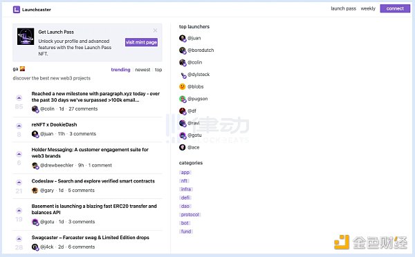 Launchcaster,Launchcaster 是一个共享和发现新 Web3 项目的地方,用户将自己的项目发布到 Farcaser,并用「@launch」回复自己的帖子,Launch 机器人便会回复一个 Launchcaster 链接,用户可以用其连接钱包以声明和编辑自己的页面。排名前 10 的发布将在 Launchcaster Weekly 电子邮件中发送。