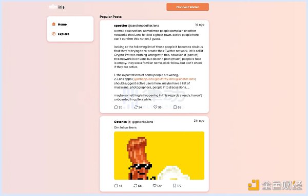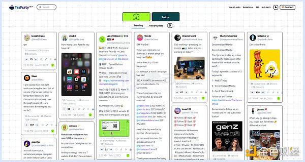Lenster,Lenster 是目前 Lens 生态最主要的应用,大部分用户与 Lens 协议的交互行为均在该应用内完成。Lenster 的用户界面与 Twitter 相似,是一款去中心化且无许可的社交媒体应用,用户可以在 Lenster 上连接其他用户的图谱 NFT,或者加入各类社区进行评论、共创、治理等互动。普通用户可以随意浏览 Lenster 上的内容动态,但想要与其进行交互则需要持有图谱 NFT。