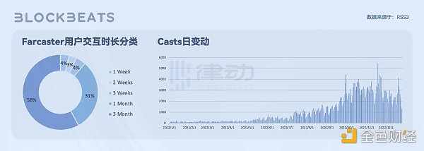 与 Clubhouse 的高质量社交裂变相似,Farcaster 通过较高的用户门槛筛选并形成纯度更高的交际圈和更活跃的下沉社区。在这种情况下,用户的需求并非获得经济激励,而是在精神层面上得到更多满足,比如与科技、社会治理、人文历史等相关领域的专业用户进行深度互动并产生共振。在下图中可以看到,Farcaster 用户无论是在交互时长还是内容发布上,均呈现出较高的活跃度和稳定性。
