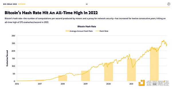 比特币的算力--矿工每秒产生的计算量,也是网络安全的代表--已经连续12年增加,在2022年达到了272 EH/s的历史最高水平。