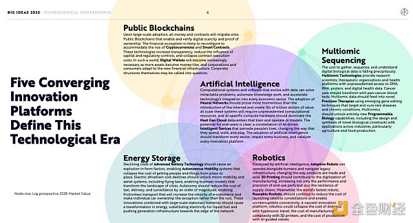 Big Ideas 2023报告将这些破坏性创新技术分为5类:公链、AI、能源存储、机器人、多组学测序。
