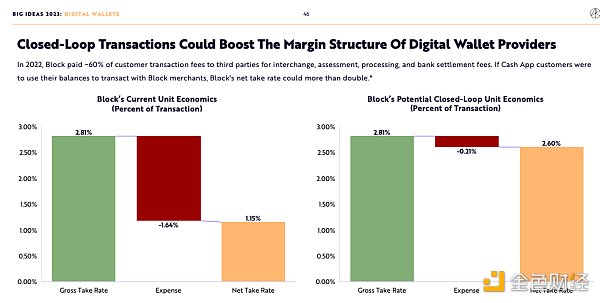 2022年,Block向第三方支付了约60%的客户交易费,用于交换、评估、处理和银行结算费用。如果Cash app的客户使用他们的余额与Block的商家进行交易,Block的净收益率可能会增加一倍以上。