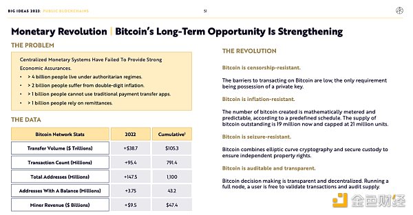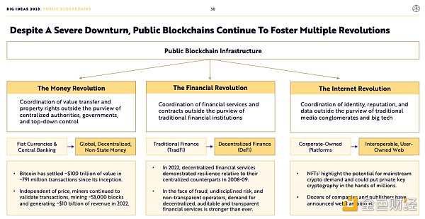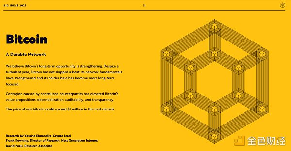 Big Ideas 2023报告认为,尽管出现了2022年加密市场经历了严重衰退,但公链在继续促进货币、金融和互联网革命发展。Big Ideas 2023报告预测,加密货币和智能合约在未来十年内可以分别获得20万亿美元和5万亿美元的市值,并再一次表示,2030年比特币价格将达到100万美元一枚。
