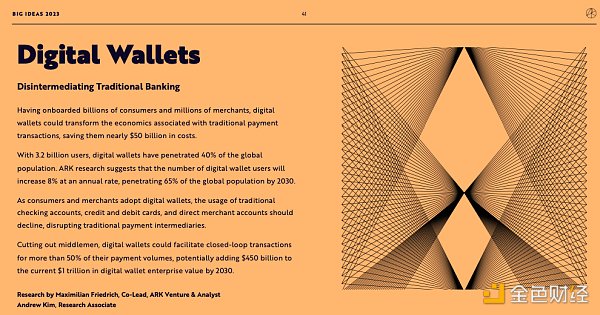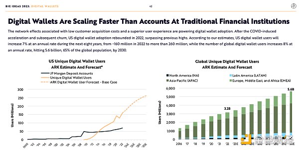 数字钱包拥有32亿用户,已经渗透到全球人口的40%。ARK研究表明,数字钱包的用户数量将以每年8%的速度增长,到2030年将渗透到全球人口的65%。
