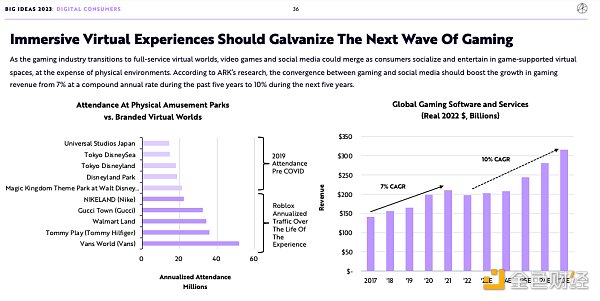 随着游戏行业向全方位的虚拟世界过渡,视频游戏和社交媒体可能会合并,因为消费者在游戏支持的虚拟空间中进行社交和娱乐,而不是在物理环境中。根据ARK的研究,游戏和社交媒体之间的融合应促进游戏收入的增长,从过去五年的复合年率7%增加到未来五年的10%。